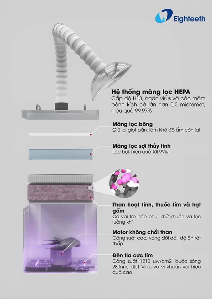 - Đèn tia cực tím sẽ khử virus và vi khuẩn ngay khi hút vào máy