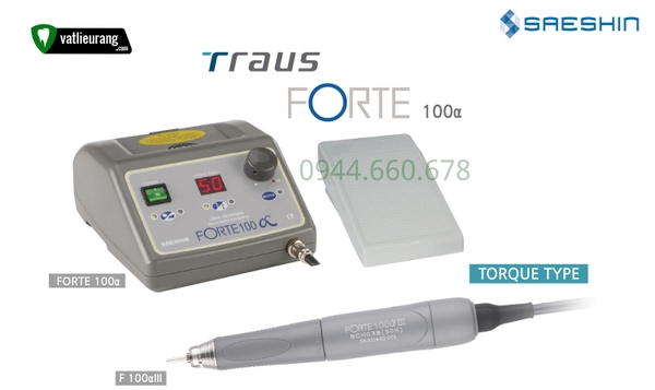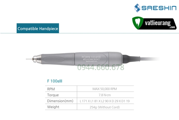 Máy mài micromotor Saeshin - Saeshin Forte 100α là sản phẩm của công ty Saeshin (Hàn Quốc). Saeshin Forte 100α có động cơ 50.000 RPM, không chổi than, tiếng ồn động cơ không lớn và độ rung thấp.